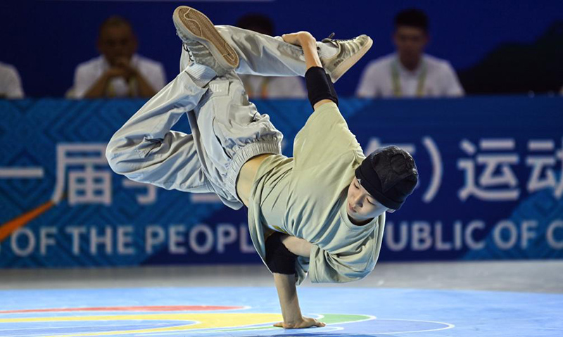 11月4日,第一屆全國學生(青年)運動會霹靂舞比賽在廣西欽州市體育中心體育館舉行。(新華社記者 張愛林/攝)