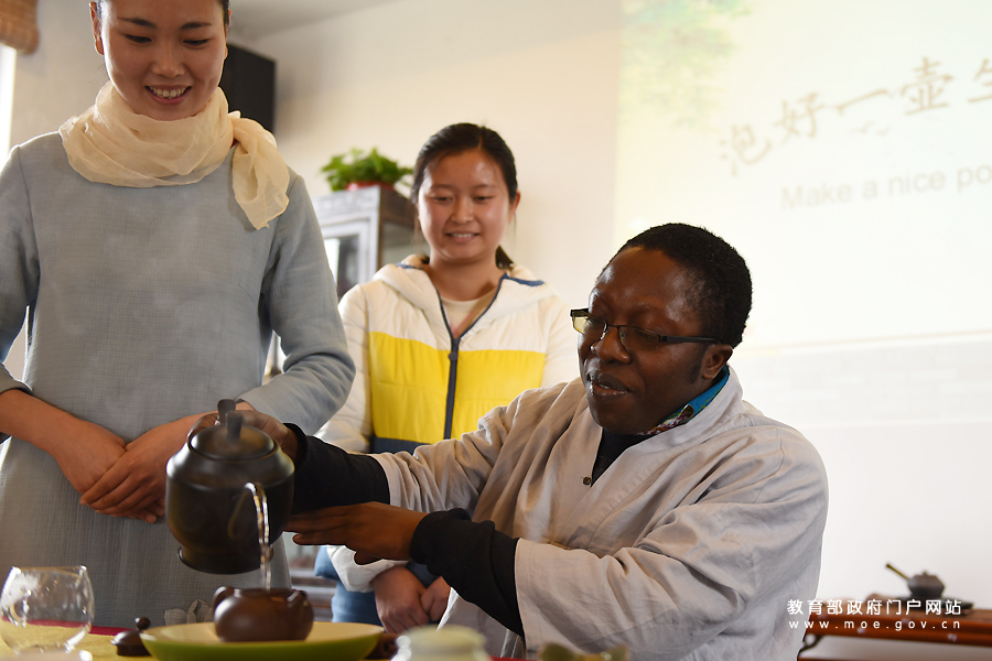 來自加納的留學生Emmanuel Kwaw在體驗沖泡茶葉。(徐國文 楊雨/攝)