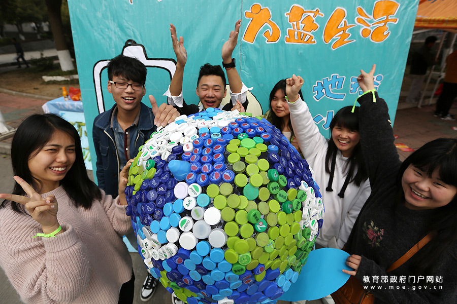 響應“地球一小時” 大學生用2016個瓶蓋搭地球模型