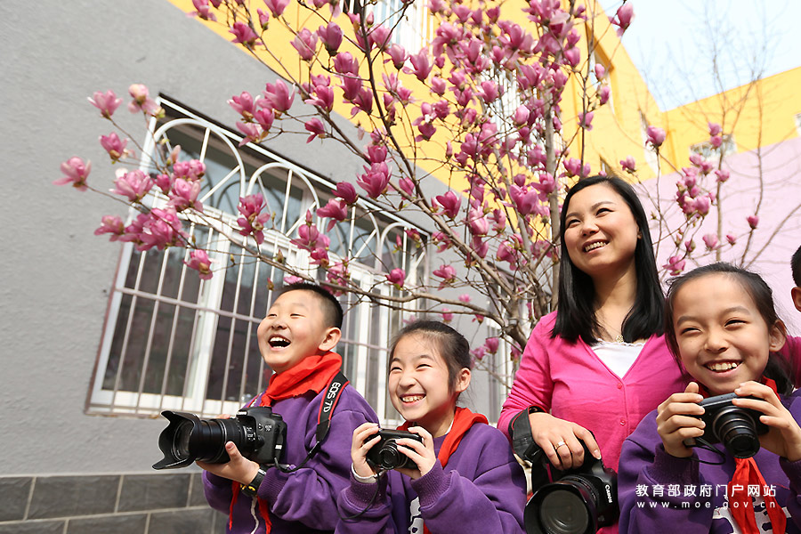 胡春凝帶領學校小攝影愛好者走出教室,拿起相機尋找校園春色、美景。胡春凝將自己多年積累的攝影經驗寫進了少先隊活動手冊、小干部培訓手冊,向全校學生及全區少先隊員普及攝影知識,幫助他們掌握一定的攝影技巧。(樊世剛/攝)