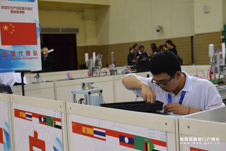 1/0自動化生產線安裝與調試國際邀請賽區,中國代表隊選聚精會神操作。(岱宗/攝 李娜/文)
