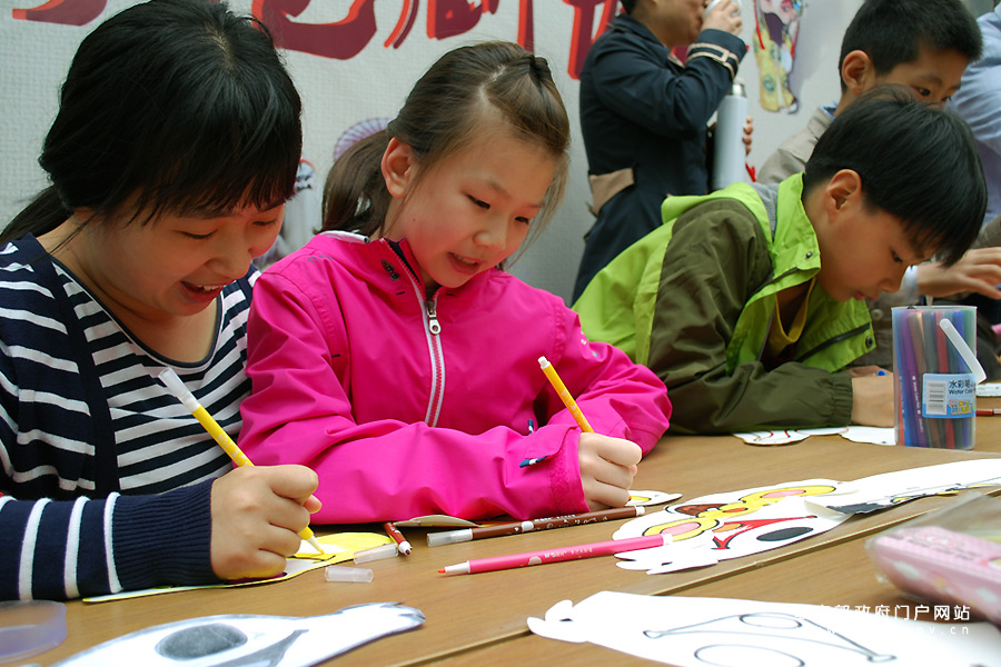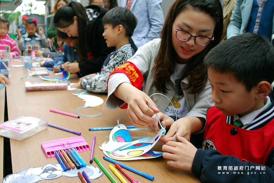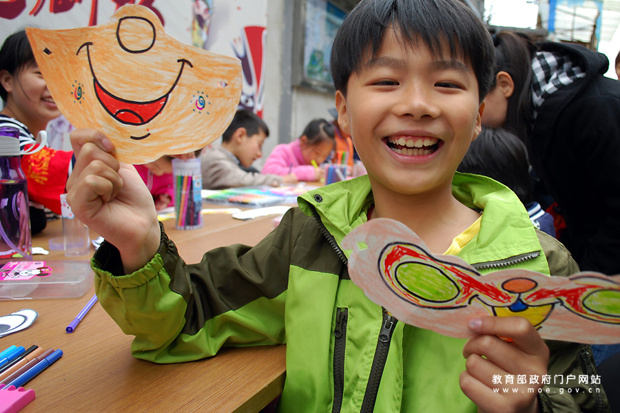 志愿者在指導小學生制作笑臉面具。(石玉成 高伏康/攝)