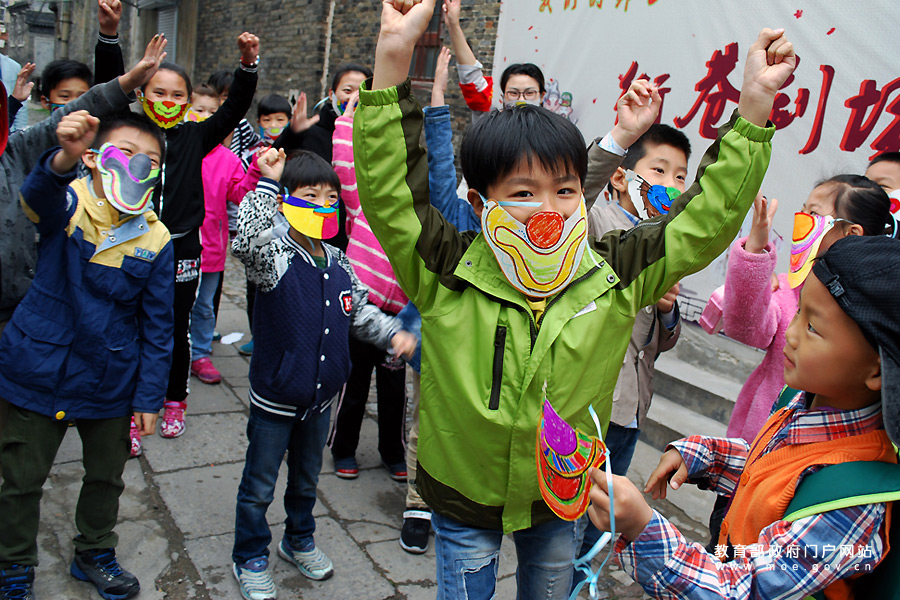 志愿者和小學生帶上笑臉面具開展互動游戲。(石玉成 高伏康/攝)