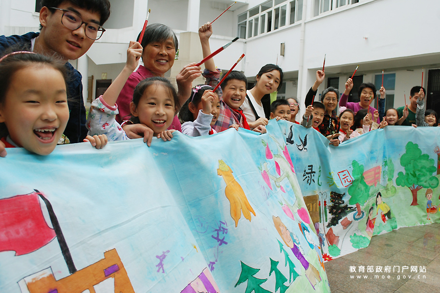 在6月5日世界環境日即將來臨之際,江蘇省鎮江市中華路小學聯合江蘇大學和金山街道迎江路中心社區志愿者,開展“攜手繪長卷,迎接環境日”活動,志愿者帶著小朋友一起在長卷上描繪他們心中的綠色家園,倡導低碳環保生活方式。(石玉成 周德帥/攝)