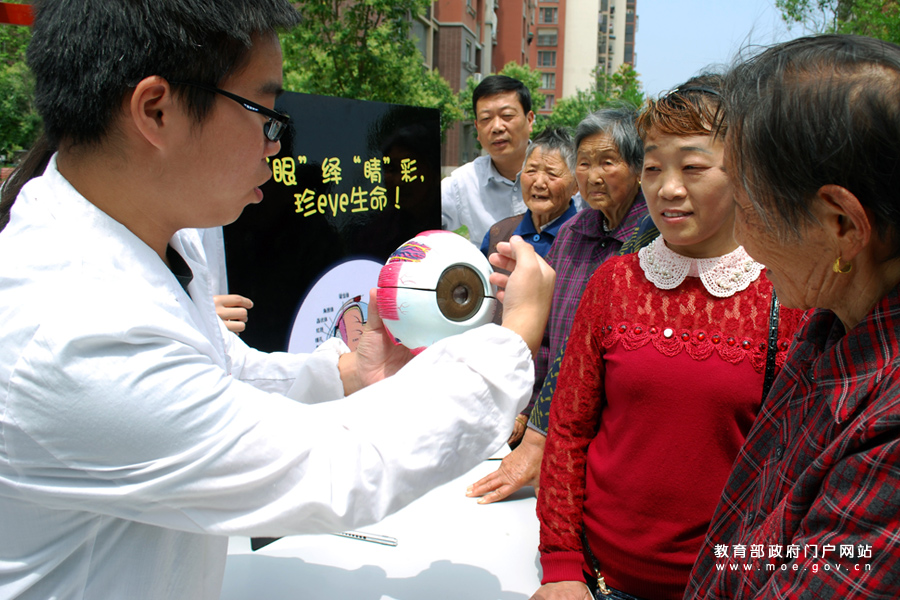 江蘇大學醫學院志愿者來到鎮江市和平路街道征潤州社區,開展“愛眼護眼從我做起”活動,為居民宣講愛眼、護眼和用眼等健康科普知識,增強居民的科學護眼意識,迎接6月6日全國“愛眼日”的到來。(石玉成 陶文杰/攝)