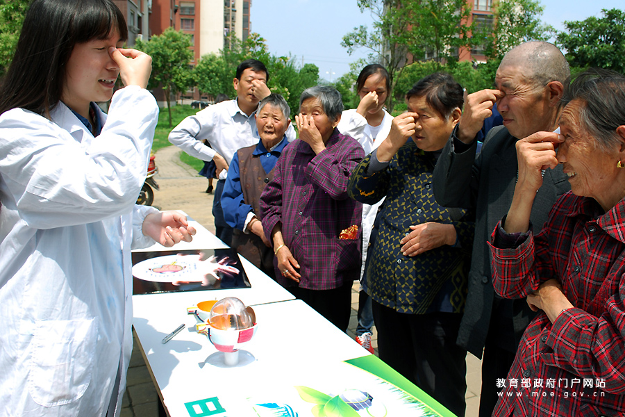 志愿者在指導居民學做眼保健操。(石玉成 陶文杰/攝)