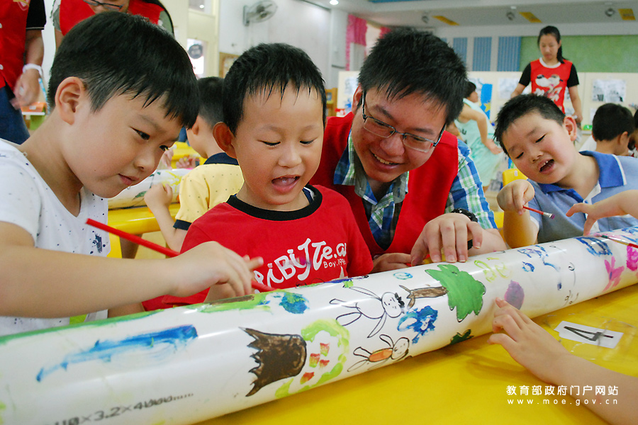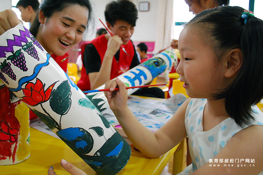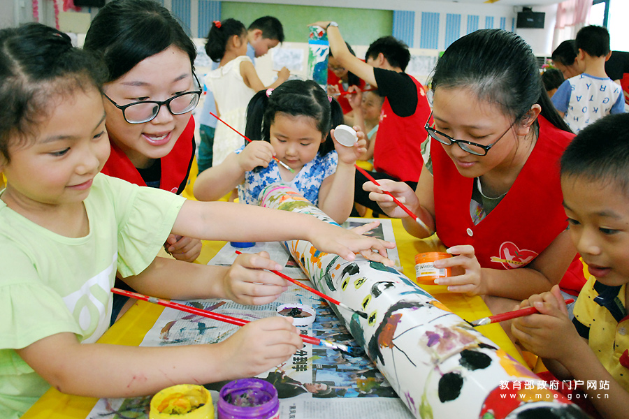 大學生志愿者指導小朋友在廢舊水管上涂鴉環保畫。(石玉成 張萍/攝)