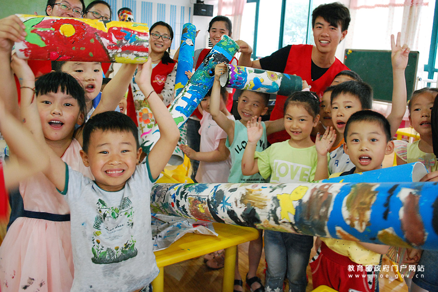 小朋友和大學生志愿者在展示他們創作的水管環保畫。(石玉成 張萍/攝)