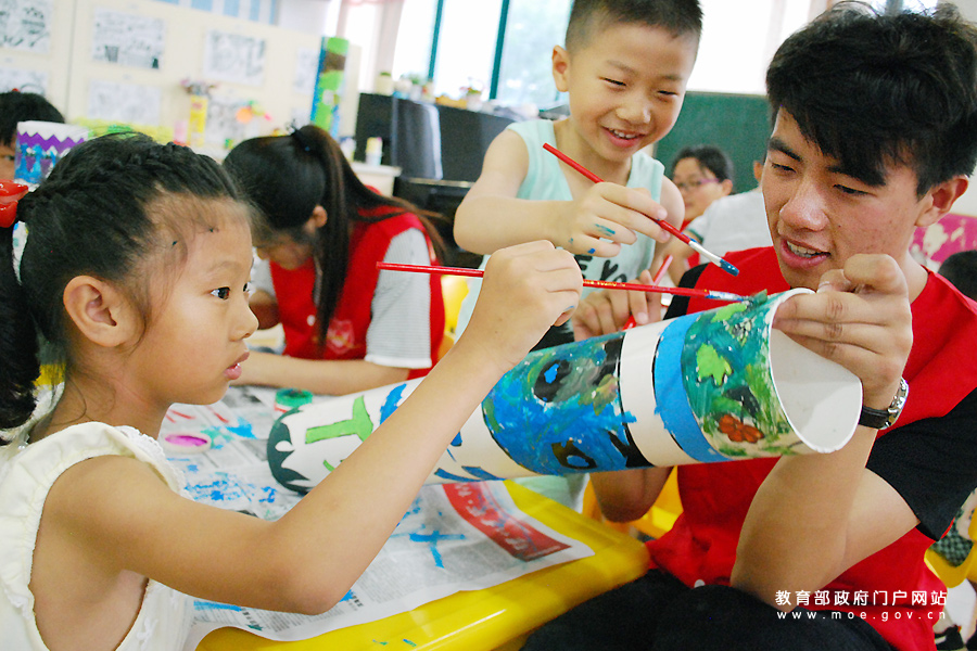 志愿者在指導留守兒童畫畫。(石玉成 丁永萍/攝)