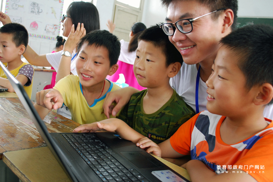 志愿者在指導留守兒童學習電腦和上網技能。(石玉成 丁永萍/攝)