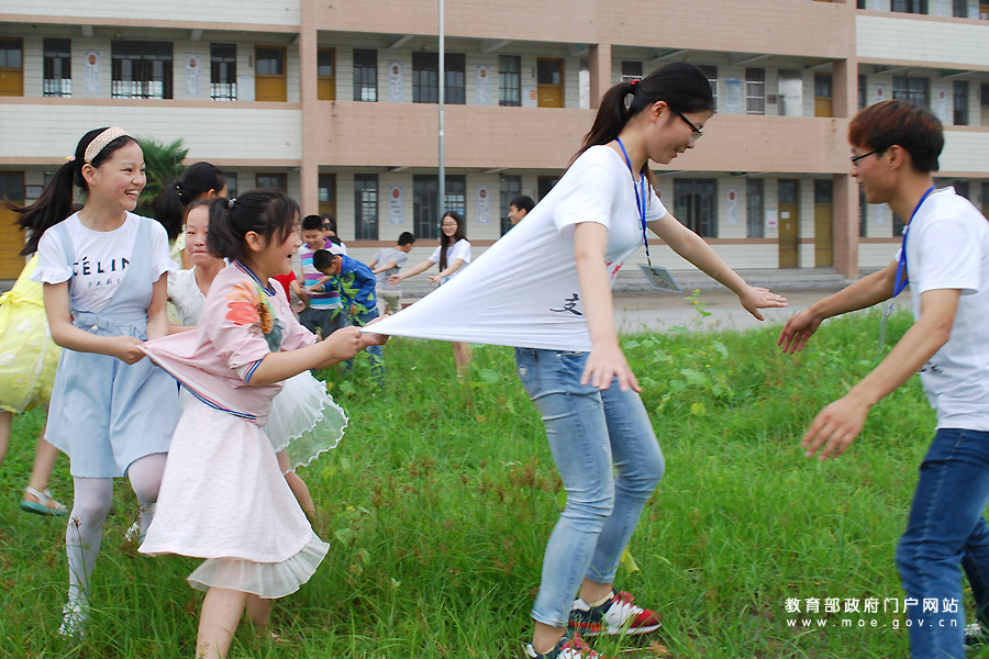 志愿者與留守兒童一起玩“老鷹捉小雞”游戲。(石玉成 丁永萍/攝)