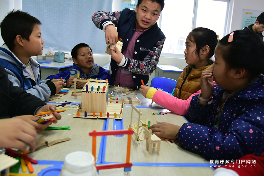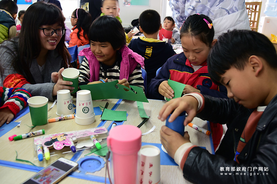志愿者指導留守兒童“變廢為寶”制作各種工藝品和玩具。(石玉成 高伏康/攝)