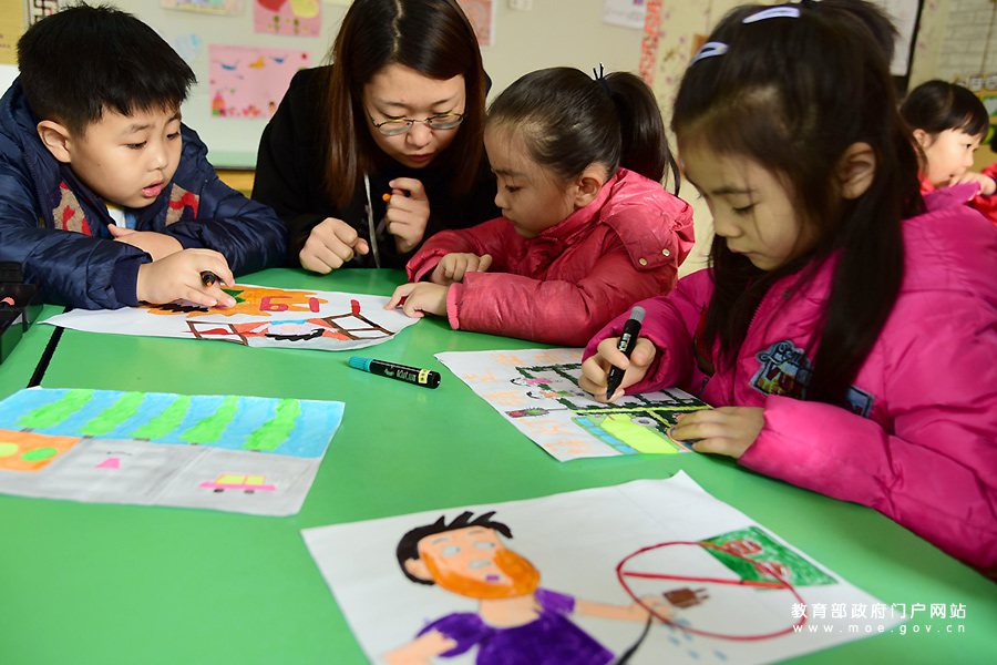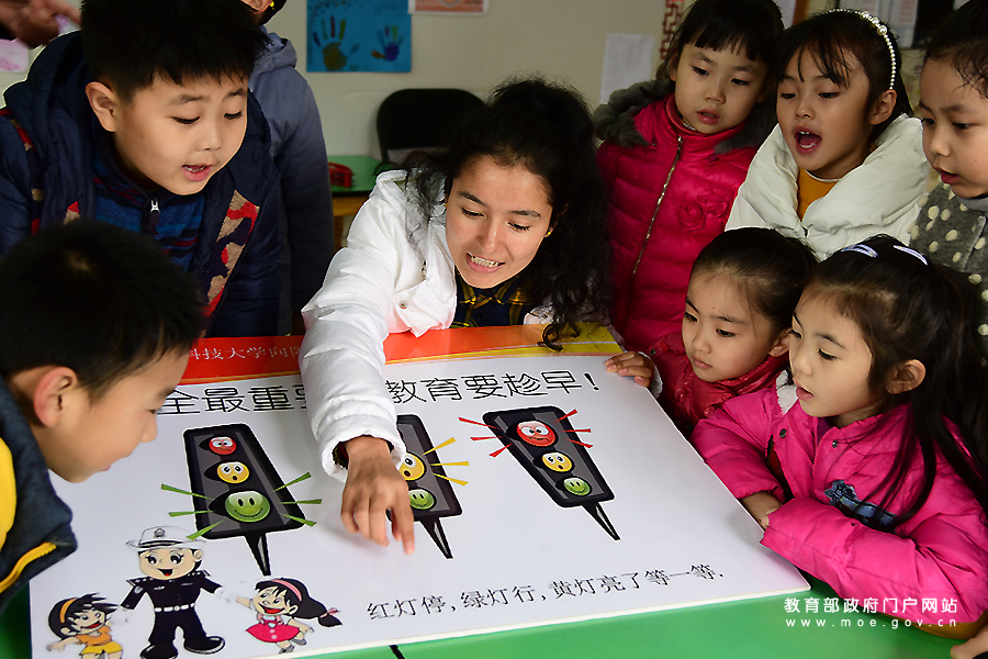 志愿者在指導幼兒學習交通安全兒歌。近日,江蘇科技大學志愿者來到鎮江市解放路大地幼兒園,開展“安全知識從小學起”活動,指導幼兒通過兒歌誦讀、趣味漫畫、涂鴉創作等形式,學習交通、消防等安全知識,引導孩子們從小增強安全意識。(石玉成 孫瑾屏/攝)