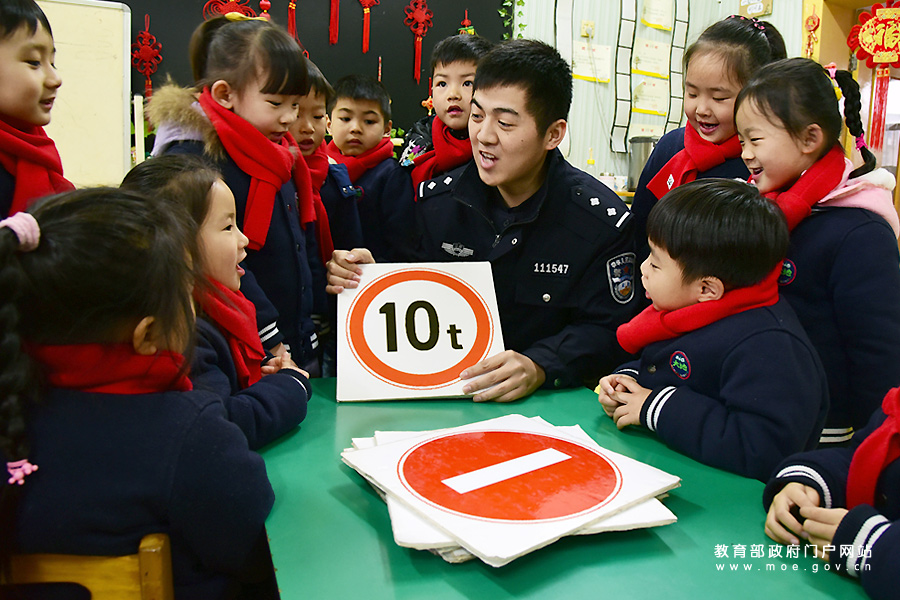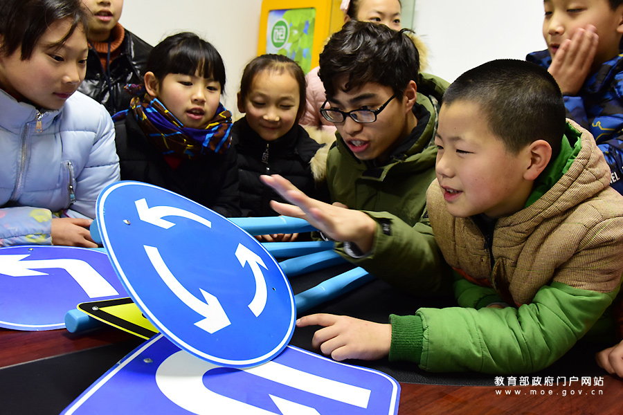 志愿者通過交通標識指導小朋友學習交通安全知識。(石玉成 孫澤宇/攝)