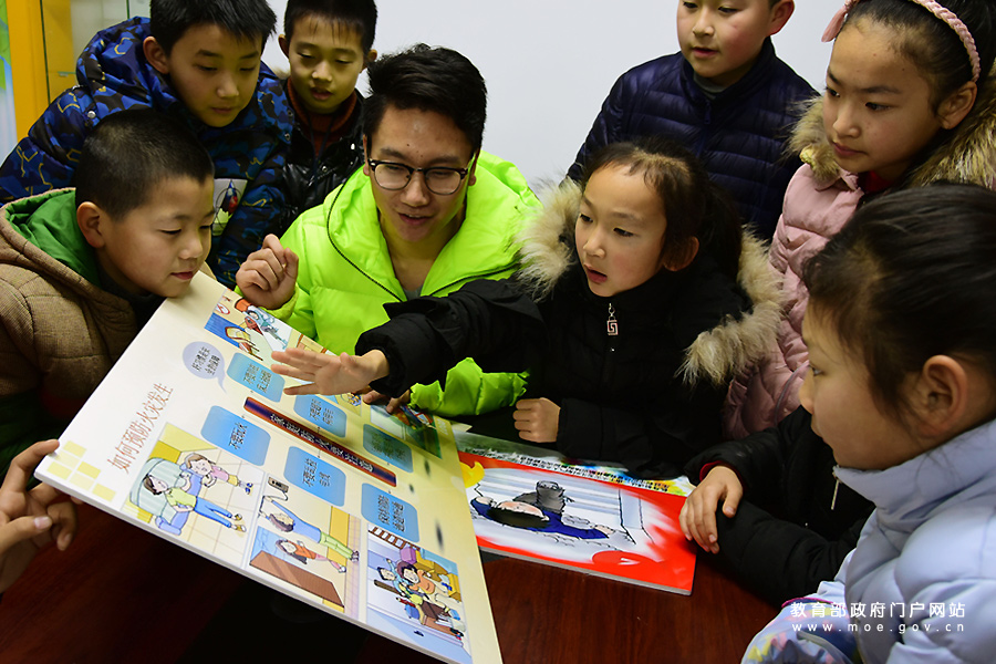 志愿者通過漫畫案例指導小朋友學習家庭防火知識。(石玉成 孫澤宇/攝)