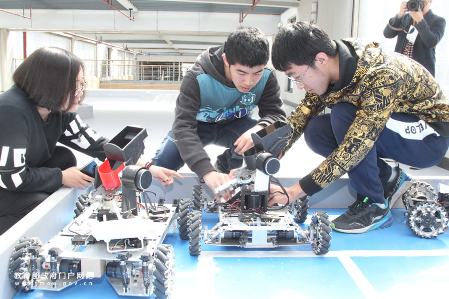 西安電子科技大學空間科學與技術學院錢學森空間科學實驗班的學生們在演示參加robomasters大賽的三臺步兵機器人。(于淼/文 樊世剛/攝 )