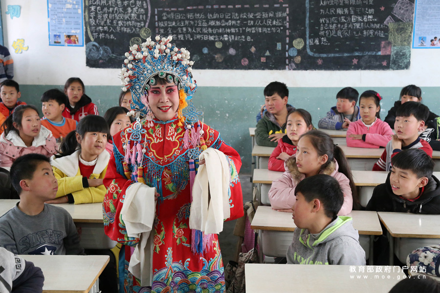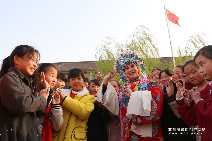 演員在河南省溫縣黃莊村小學為學生們表演豫劇。(徐宏星/攝)
