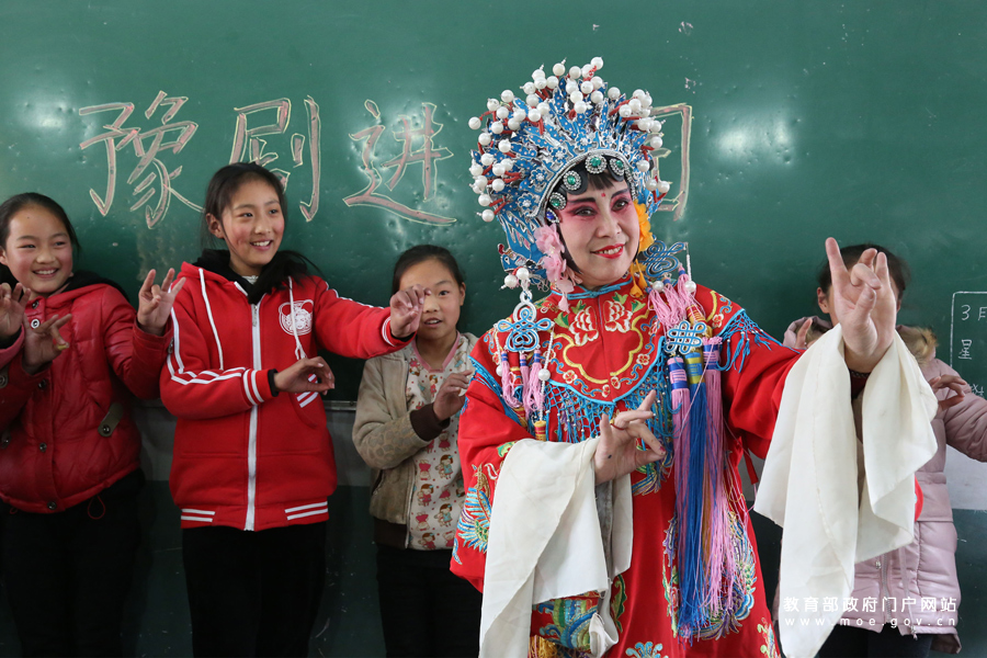 近日,河南省溫縣群星豫劇團的演員們應邀走進溫縣黃莊村小學,指導學生們學習戲曲唱腔和表演藝術,讓學生們與豫劇“親密接觸”,感受傳統戲曲的魅力。(徐宏星/攝)