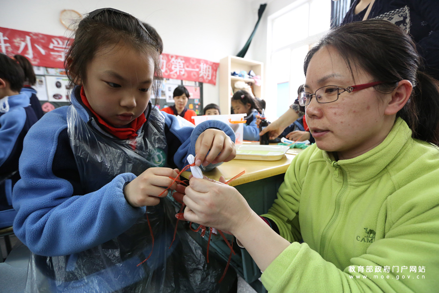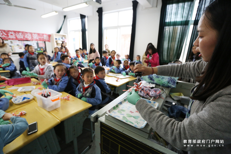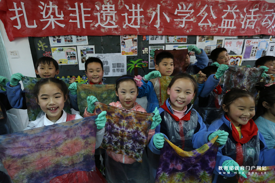 江蘇大學開展“扎染非遺進小學”公益活動。該校大學生走進江蘇大學附屬小學,向小學生們介紹“扎染”的歷史和知識,并指導他們制作,讓他們在學習和動手中感受傳統文化的魅力。(楊雨/攝)