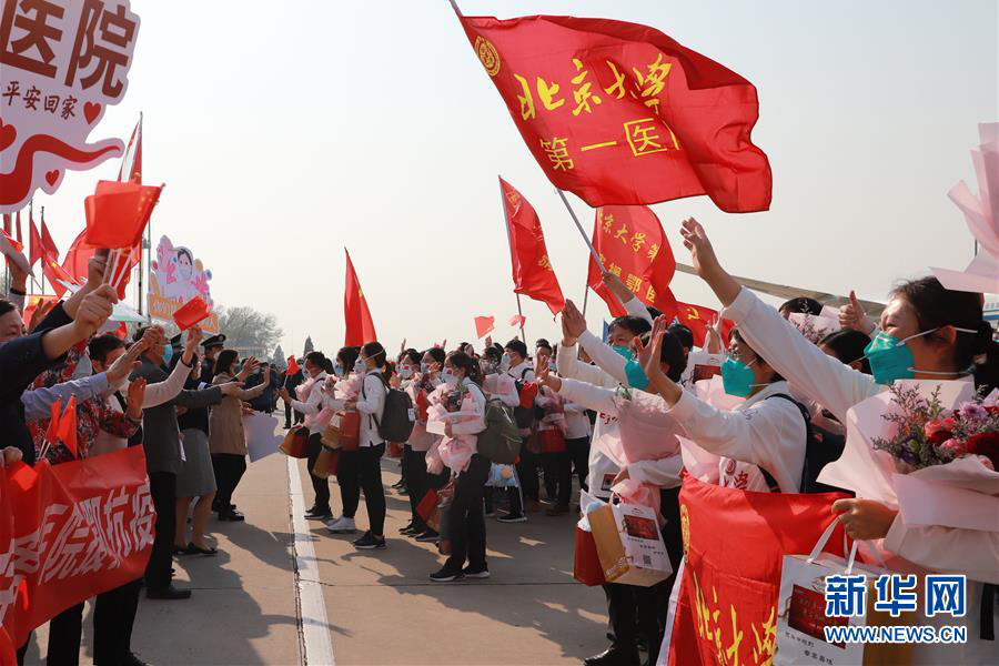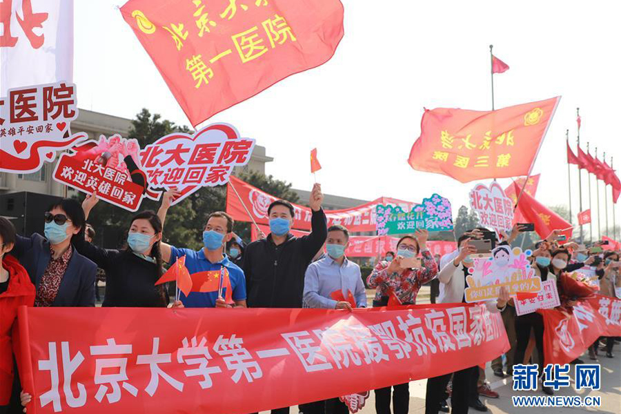 4月6日,人們在機場迎接醫療隊隊員返回。(新華社發 北大醫院供圖)