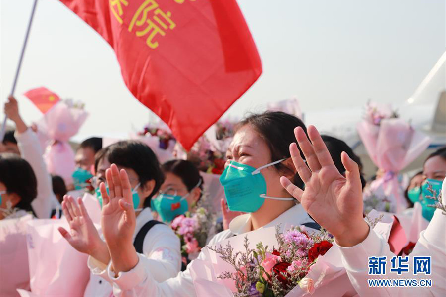 4月6日,北京大學第一醫院醫療隊隊長、呼吸和危重癥醫學科副主任馬靖(中)向歡迎的人群揮手。(新華社發 北大醫院供圖)