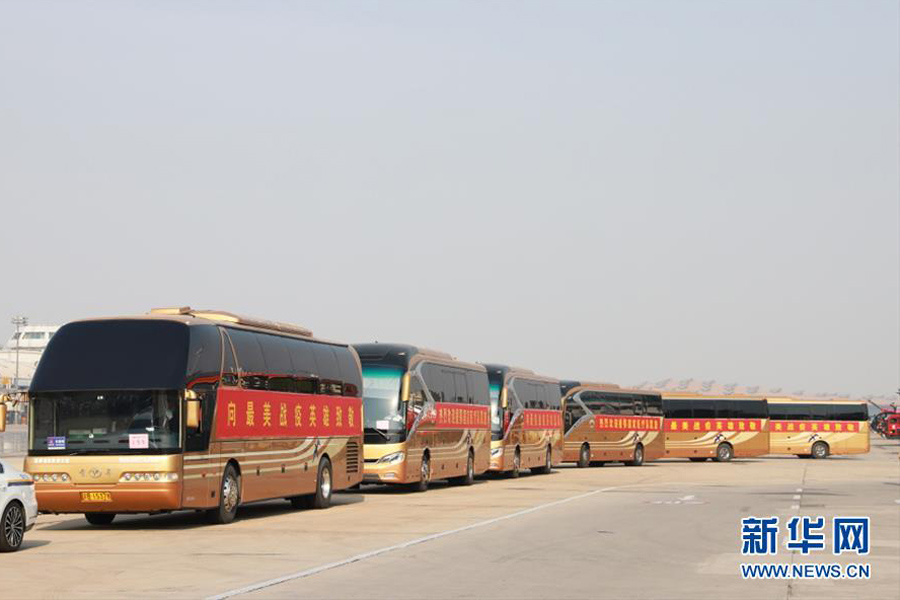 4月6日,醫療隊隊員乘坐大巴車準備前往隔離休整地點。(新華社發 北大醫院供圖)