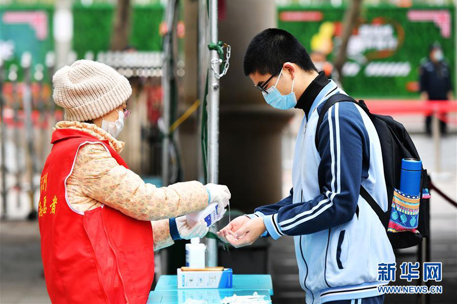 4月7日,福州屏東中學的高三年級學生在校門口進行雙手消毒。(新華社記者 魏培全/攝)