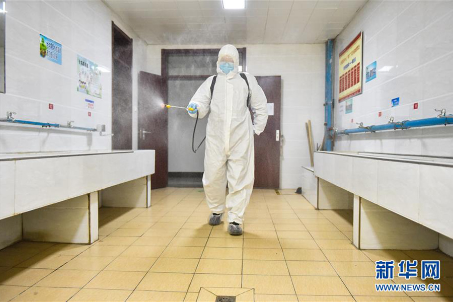 4月9日,在太原理工大學明向校區學生公寓樓,工作人員在給盥洗室消毒。(新華社發 柴婷/攝)
