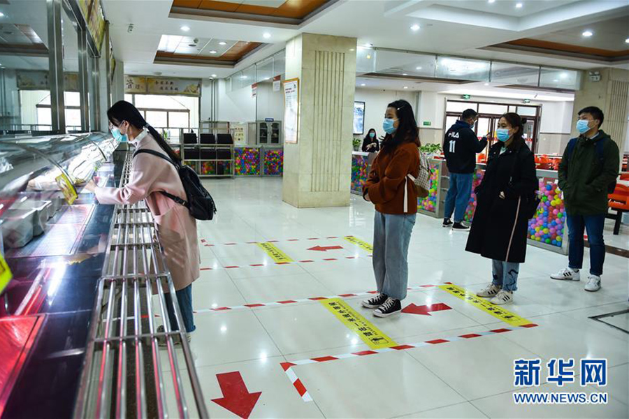 4月9日,在太原理工大學明向校區靜雅軒餐廳,提前到校的學生志愿者間隔一米排隊就餐。(新華社發 柴婷/攝)