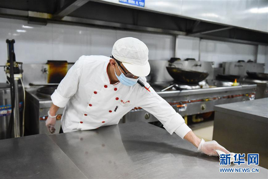 4月9日,在太原理工大學明向校區靜雅軒餐廳,工作人員在擦拭后廚桌面。(新華社發 柴婷/攝)
