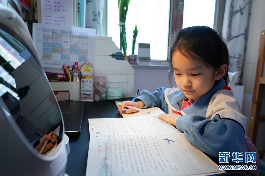 4月13日,北京市朝陽師范學校附屬小學(西壩河校區)三年級學生馬紫涵在家中按照新學期課表預習語文課程。(新華社記者 鞠煥宗/攝)