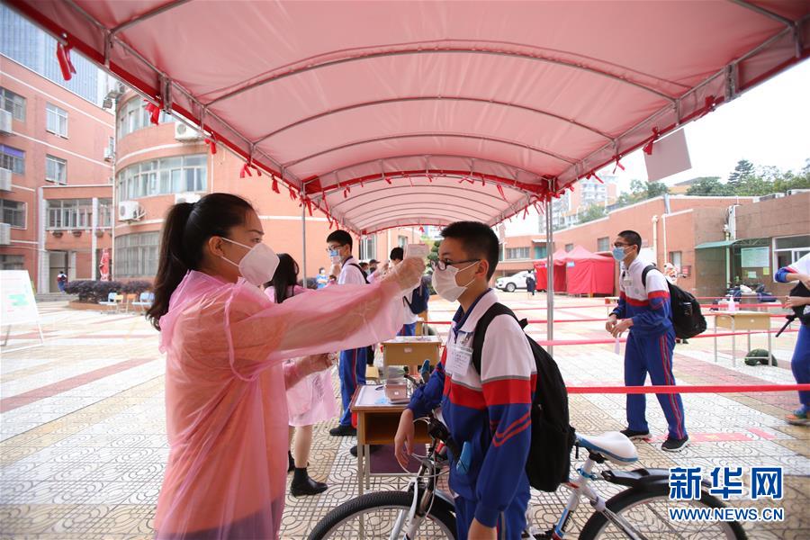 4月20日,在廈門松柏中學初中部,初三年級學生接受體溫測量。(新華社發 曾德猛/攝)