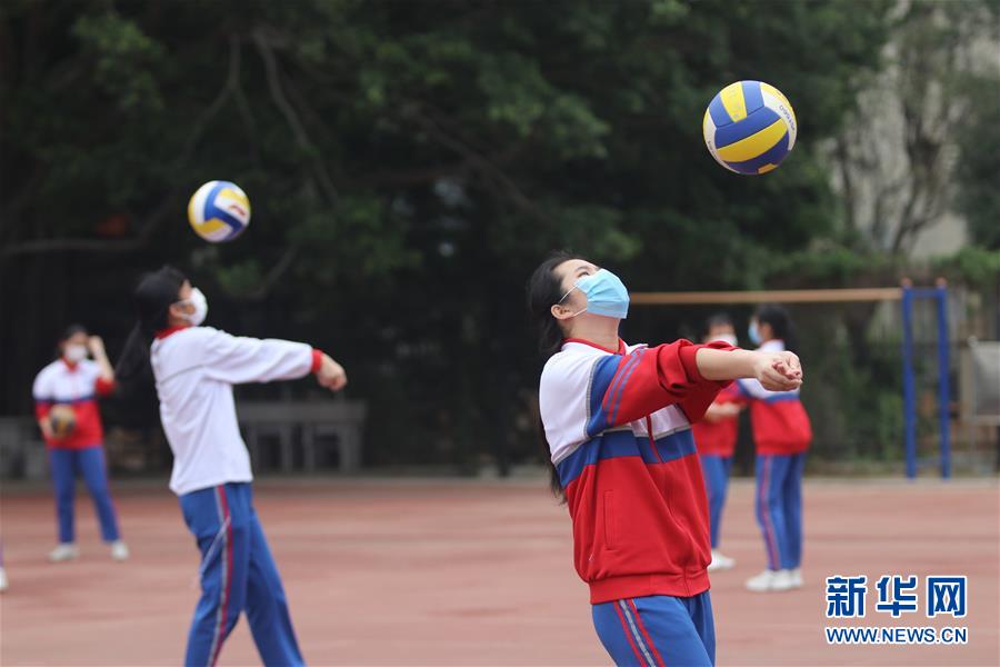 4月20日,在廈門松柏中學初中部,初三年級學生在體育課上打排球。(新華社發 曾德猛/攝)