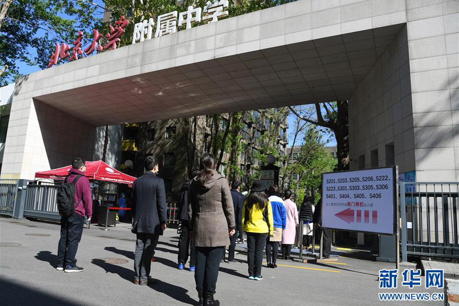 4月26日,合肥市肥西縣紫蓬鎮中心學校學生入校接受體溫測量。當日,安徽省合肥市小學四、五、六年級及高一、初一年級開學復課。(新華社記者 劉軍喜/攝)