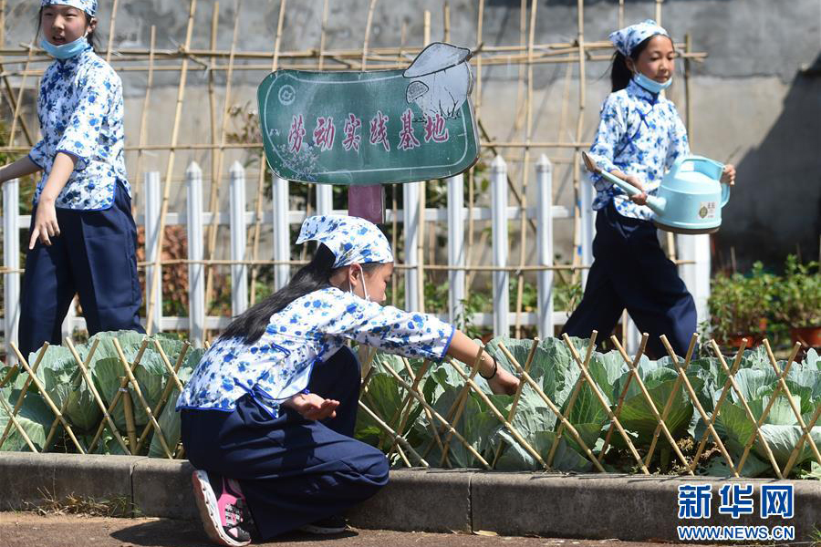 4月29日,浙江諸暨上聯小學五年級的學生在學?!盎愚r場”內勞動。(新華社記者 韓傳號/攝)