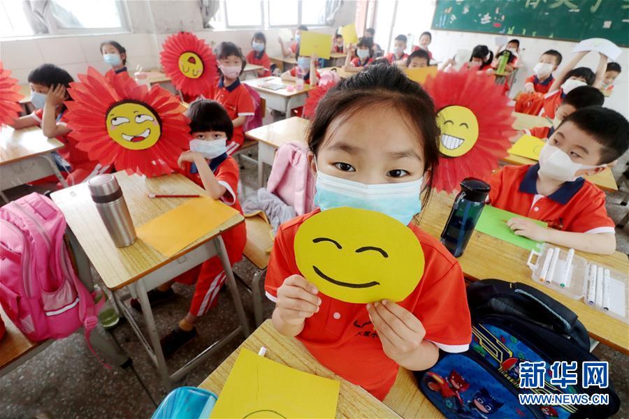 5月7日,在湖南省漣源市橋頭河鎮大屋聯校,孩子們展示自己制作的笑臉。(新華社發 張揚/攝)