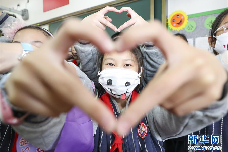 5月7日,在江蘇淮安市實驗小學(新城校區),學生們在“特別的微笑 榜樣的力量”主題繪畫活動中展示在口罩上繪制的笑臉。(新華社發 趙啟瑞/攝)