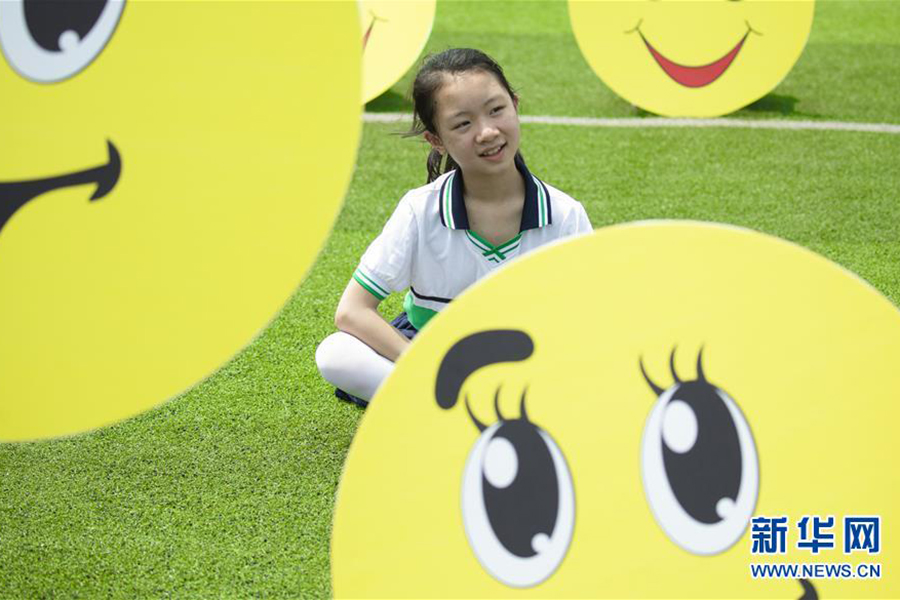 5月7日,在湖南省東安縣舜德學校,學生們在操場上擺出笑臉造型。(新華社發 嚴潔/攝)