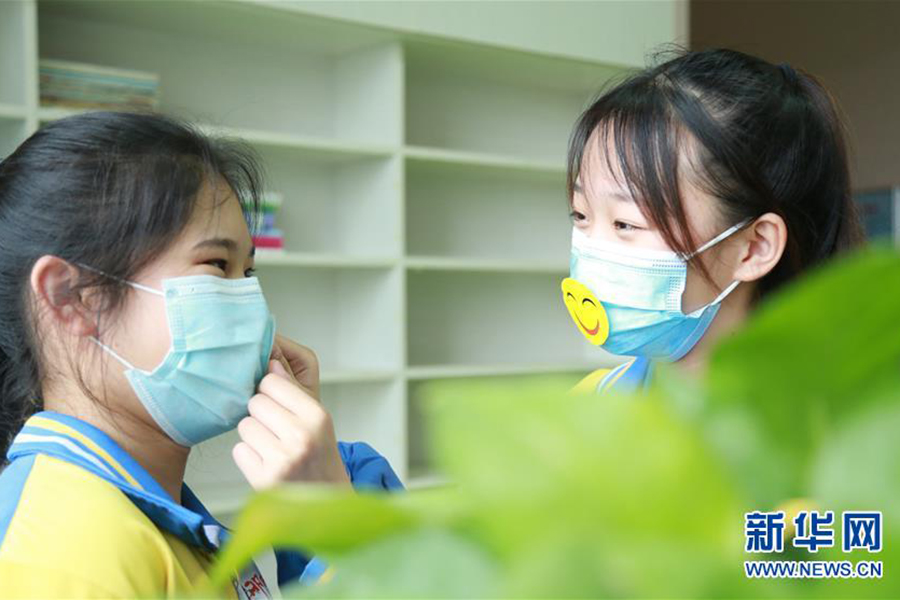 5月7日,河北省邢臺市第十中學初三年級學生相互佩戴微笑卡迎接“世界微笑日” 。(新華社發 張馳/攝)