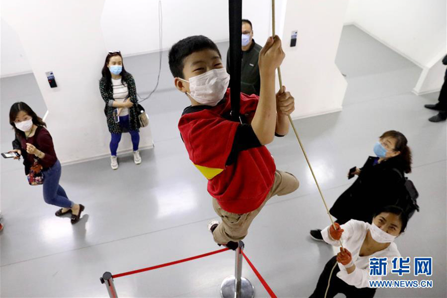 5月11日,在河北省石家莊公共安全體驗館,講解員為小朋友講解系逃生安全繩的方法。(新華社發 梁子棟/攝)