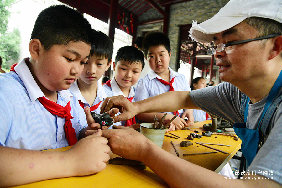 6月12日,在鎮江市西津古渡社區,民俗專家周寶康在指導小學生學習泥叫叫制作技藝。(石玉成/攝)
