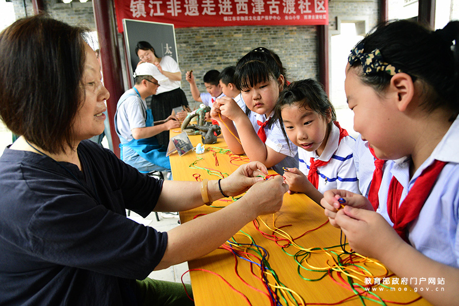 6月12日,在鎮江市西津古渡社區,民俗專家安永鳳在指導小學生學習編織中國結。(石玉成/攝)