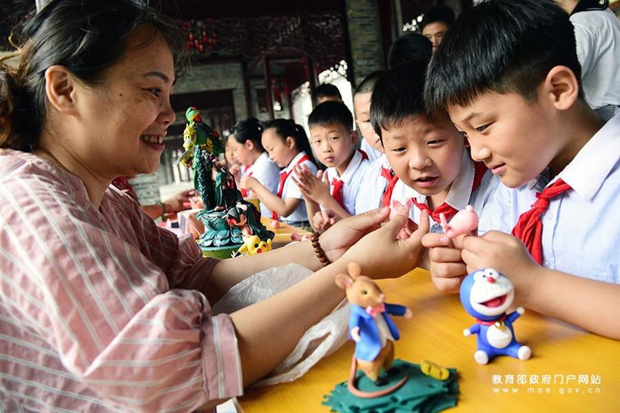 6月12日,在江蘇省鎮江市西津古渡社區,民俗專家張娟在指導小學生學習面塑制作技藝。(石玉成/攝)
