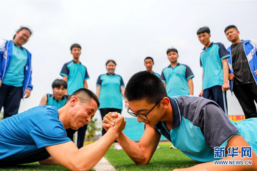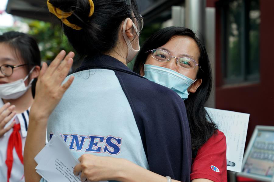 6月27日,在上海市閔行區莘松中學考點,送考的老師擁抱即將進入考場的學生,送上祝福。(新華社記者 劉穎/攝)