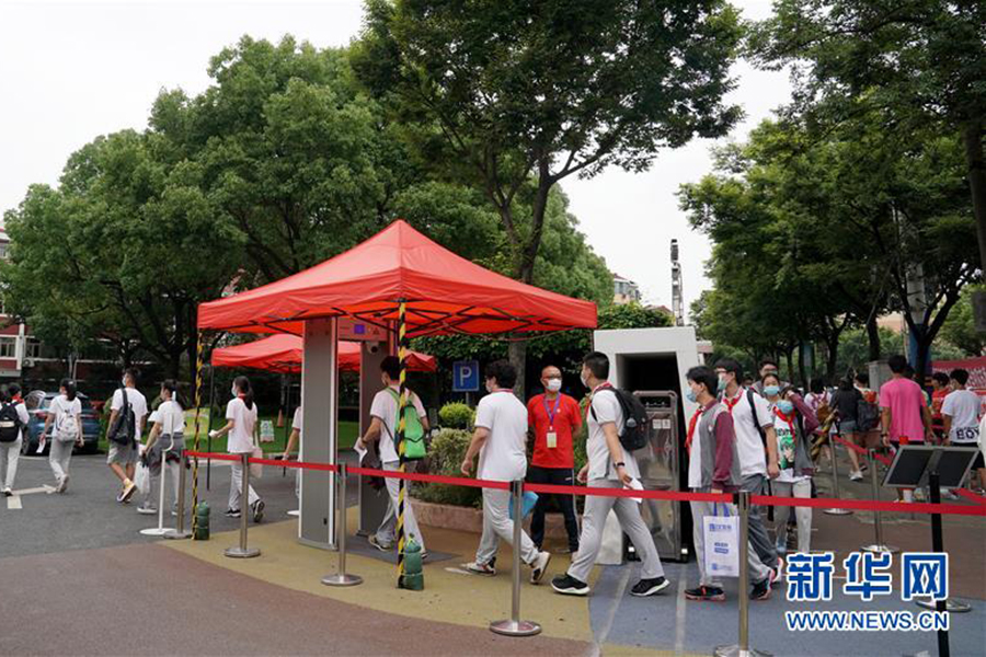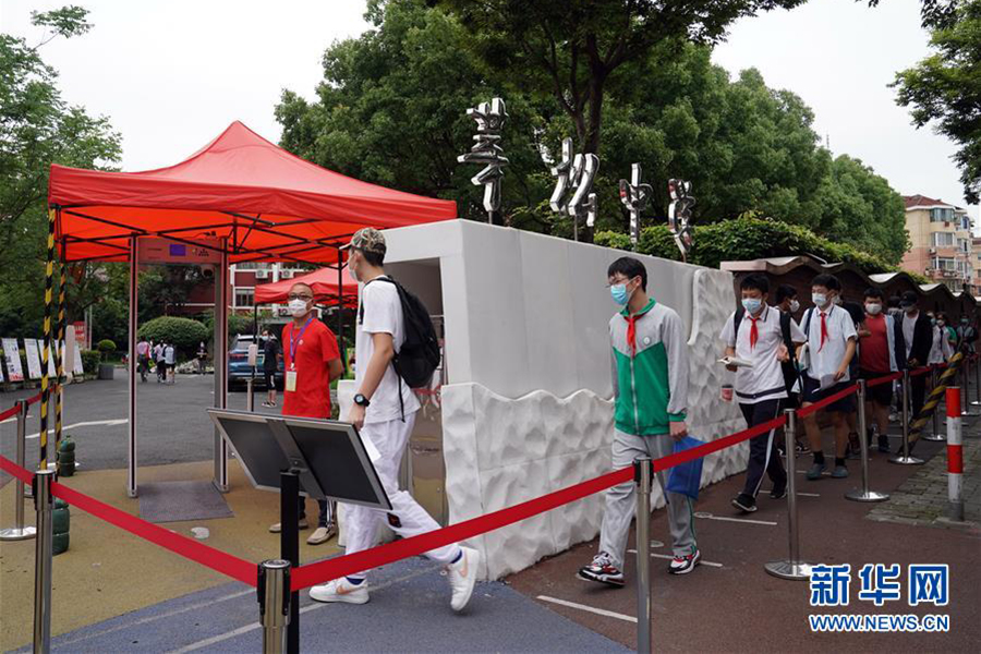 6月27日,在上海市閔行區莘松中學考點,考生依次通過測溫門進入校園。(新華社記者 劉穎/攝)