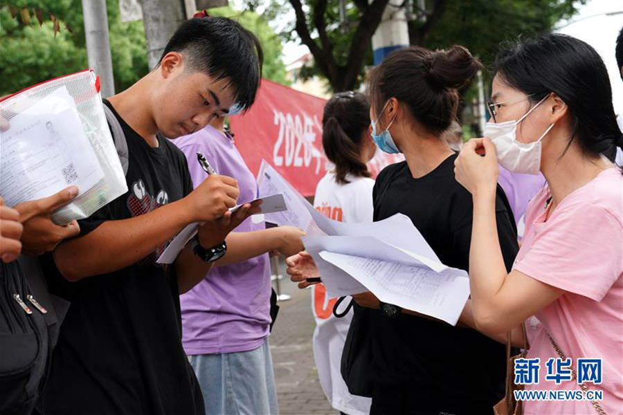 6月27日,在上海市閔行區莘松中學考點前,上海市第二體育運動學校的學生在《考生考試安全承諾書》上簽名,然后統一交考點保存。(新華社記者 劉穎/攝)