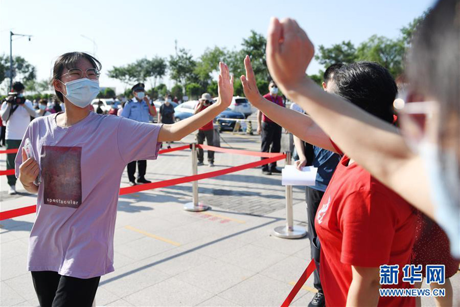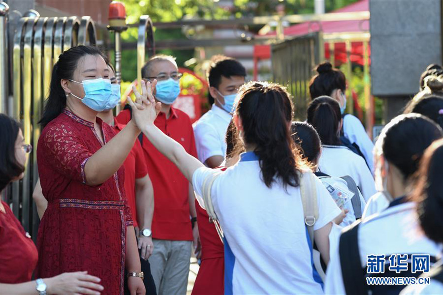 7月7日,考生在北京市門頭溝區大峪中學考點進入考場前與送考老師擊掌。(新華社記者 鞠煥宗/攝)