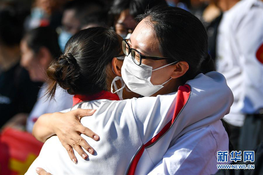 7月7日,老師(右)在呼和浩特市第二中學考點外擁抱即將參加高考的考生。(新華社記者 貝赫/攝)