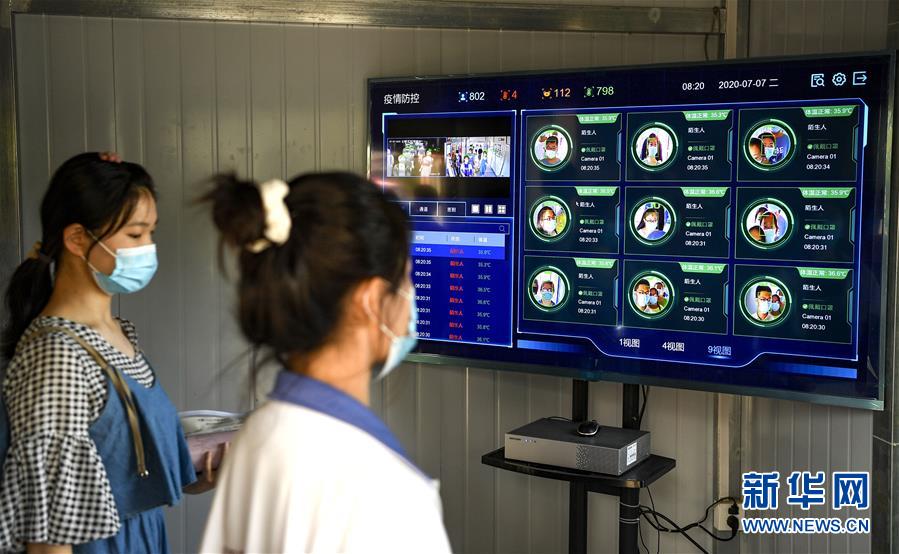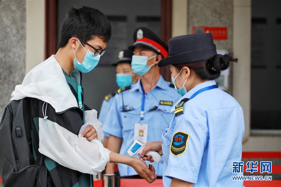 7月7日,在貴州省六盤水市第三中學考點,考生在進入考場前檢測體溫。(新華社記者 劉續/攝)