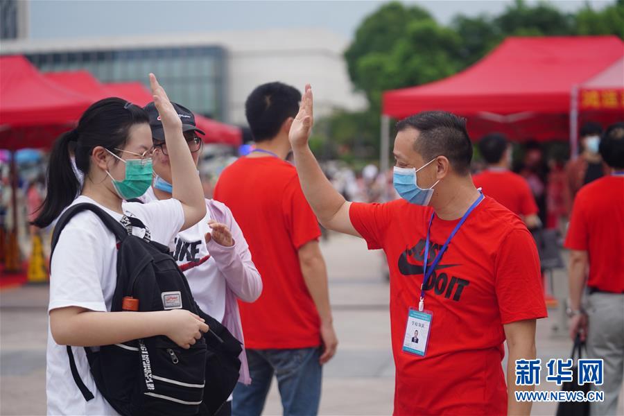 7月7日,在南昌二中考點門前,送考老師與考生擊掌。(新華社記者 周密/攝)